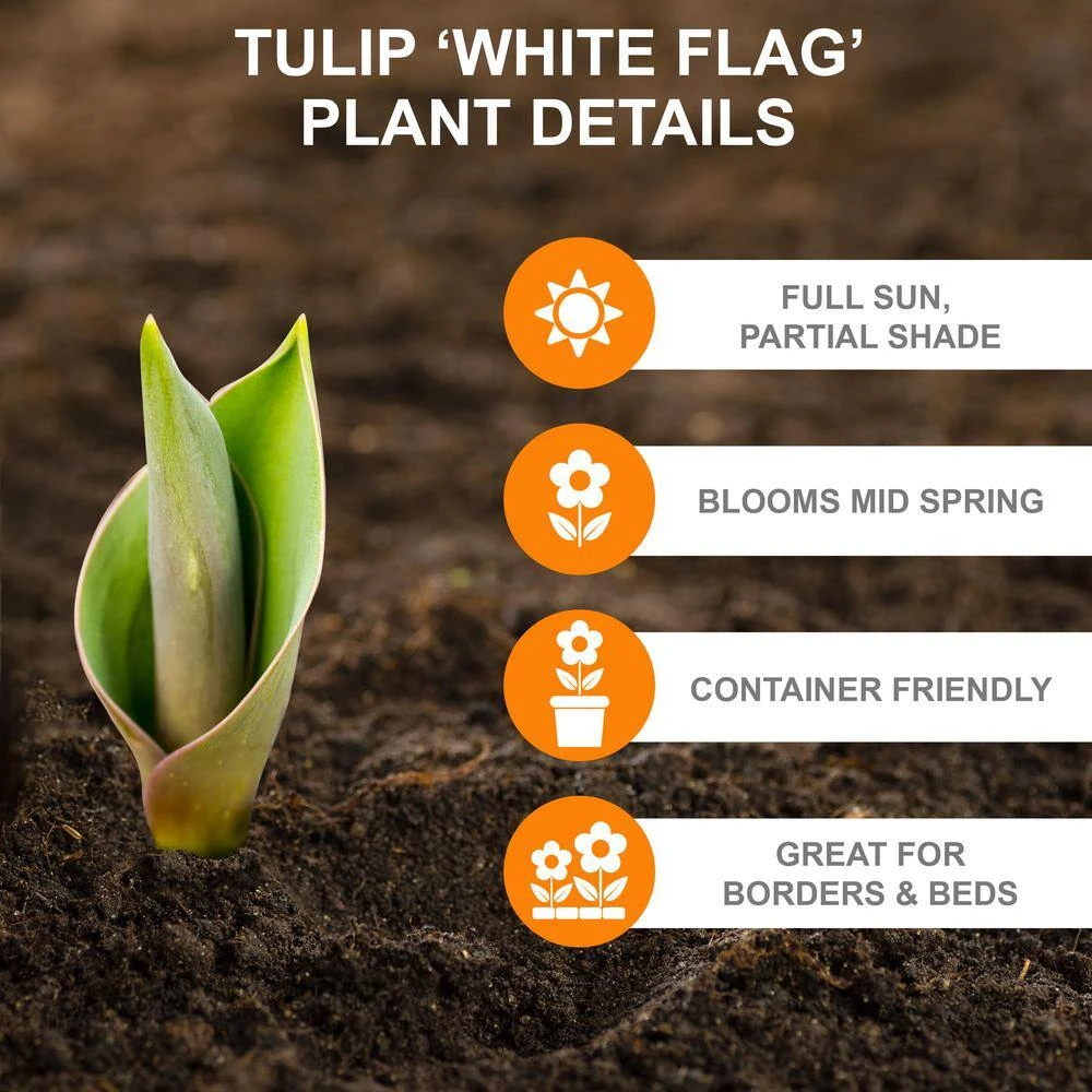 Garden State Bulb White Flag Triumph Tulip bulbs are sourced from expert growers in Holland. These bulbs measure about 5 in. (12/+ cm) in circumference and are handpicked and checked for quality before shipping to your door. Blooming in mid-spring, these bulbs produce majestic flowers that stand tall at 18 to 20 in. As the season unfolds, prepare to be enchanted by the graceful beauty of these Triumph White Flag Tulips. Their pristine white blooms, delicately accented with hints of ivory, bring a sense of purity and serenity to any outdoor space. Whether you’re admiring them from afar or cutting them to create elegant floral arrangements, these tulips never fail to captivate with their simple yet striking presence.