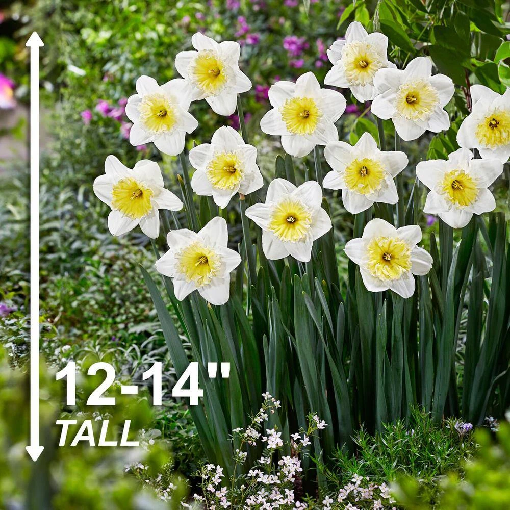 Introducing the Garden State Bulb Narcissus Large Cupped Ice Follies Daffodil Flower Bulbs sourced direct from Holland and a captivating addition to any spring garden. Each bulb measures about 6-6.5 inches (16-18 cm) in circumference and is handpicked and checked for quality before shipment. These exquisite daffodils bloom in mid-spring, adorning your outdoor space with their enchanting beauty. Standing at a moderate height of 14 inches tall, they bring a perfect balance of elegance and charm to garden beds, borders, or containers. The Ice Follies Daffodil showcases a classic large cupped shape, featuring a prominent central cup surrounded by gracefully recurved petals, adding timeless allure to your garden landscape. Easy to grow and maintain, these daffodils are suitable for gardeners of all levels, requiring only well-drained soil, sunlight, and occasional watering. Deer resistant and winter hardy, they offer reliability and peace of mind, while their cut flower potential allows you to bring the joy and fragrance of spring indoors.