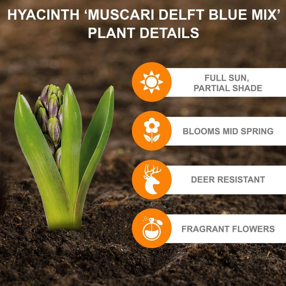 Garden State Bulb Muscari Delft Blue Grape Hyacinth flower bulbs are sourced and imported from the world-renowned farms and growers of The Netherlands. Bulbs measure about 3 in. to 3.5 in. (8 cm to 9 cm) in circumference and should feel firm to the touch. The Delft Blue Grape Mix Flowers are a delightful addition to any garden, offering both visual appeal and a captivating fragrance. Picture yourself surrounded by the captivating fragrance of these delightful grape hyacinths as you wander through your garden-a sensory experience that’s bound to uplift your spirits and soothe your soul. But that’s not all-these bulbs also offer visual allure with their clusters of tiny, bell-shaped flowers that resemble grapes. Whether nestled in borders, gracing rock gardens or adorning decorative containers, these bulbs thrive in various garden settings, allowing you to create stunning displays that reflect your unique style and personality.