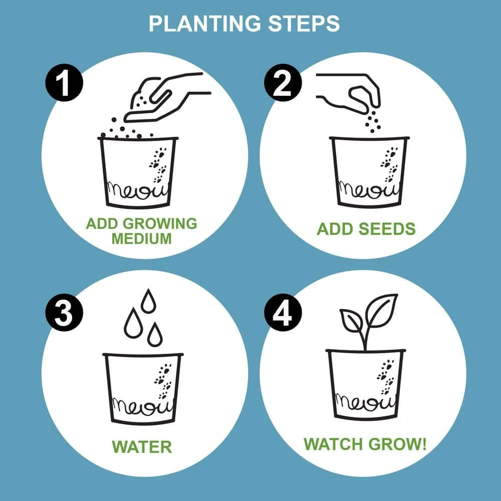 - 1. Fill each planter with the growing medium included in the kit.2. Carefully open the seed packets and sprinkle the seeds evenly over the surface of the growing medium.3. Lightly press the seeds into the surface of the growing medium, do not bury.4. Gently water the seeds to moisten. Keep the growing medium moist, not wet.5. Do not over water, to avoid rotting, or allow the growingmedium to completely dry out.6. Place in a warm and sunny location, protected from frost. For best results, rotate the planter often so all sides receive equal sunlight.7. Catnip seeds germinate in approximately 10-15 days and are ready to harvest approximately 70-90 days after planting.8. Cat Grass seeds germinate in approximately 2-3 days and are ready to harvest approximately 7-14 days
