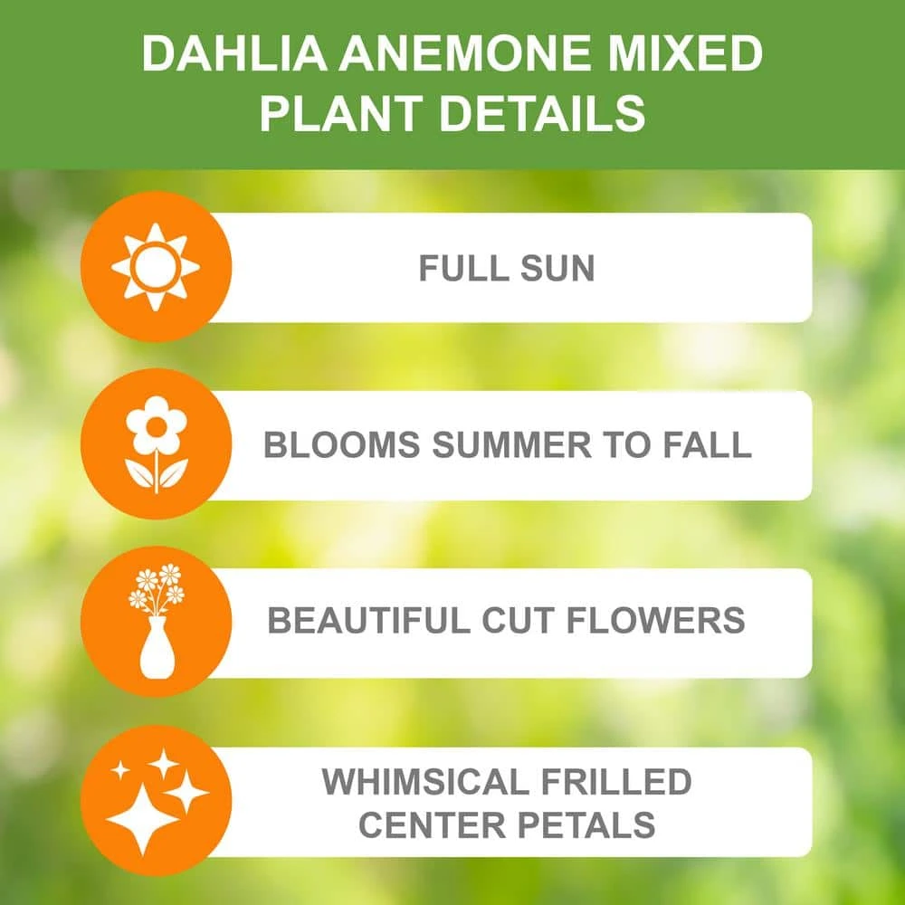 - Includes bag of 12 Dahlia Anemone mixed tubers, temperature controlled and shipped with care