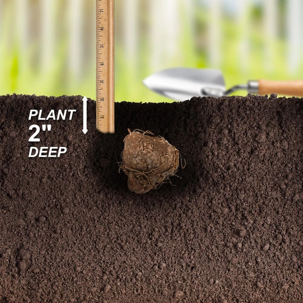 - 1: select a well-drained location that receives full shade to partial Sun, before planting, soil temperature needs to be at a minimum of 65°F, 2: loosen soil and dig a hole a little deeper than the indicated depth, 3: plant caladium bulbs so the top of the bulb is about 2 in. below the soil surface and each bulb about 5 in. to 6 in. apart, place bulb with the roots facing down and any sprouts facing up, 4: after planting, water well so that the soil above the bulbs settles, keep soil moist during periods of dry weather but do not overwater
