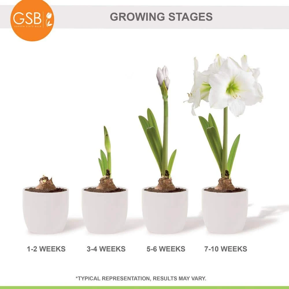 Celebrate a snowy holiday season with Garden State Bulb White Christmas Amaryllis Bulbs., the ultimate touch of elegance and cheer, Each bulb, measuring 11 in. to 12- in. (2-8/3-0cm) in circumference, is carefully sourced from Central and South America, where expert growers ensure top-quality cultivation. These exquisite bulbs. produce 1 to 2- stems per bulb, each showcasing 2- to 3- stunning white blooms that can last up to 6 weeks or more. Picture multiple large blossoms on tall stalks reaching up to 2-4 inches tall-each as delicate and unique as a snowflake. When planted indoors, you’ll see these gorgeous blooms emerge in just 7-10 weeks. Perfect as a striking centerpiece or a sophisticated bouquet, the White Christmas Amaryllis is low-maintenance and may even return year after year, adding a touch of snowy brilliance to your holiday celebrations.